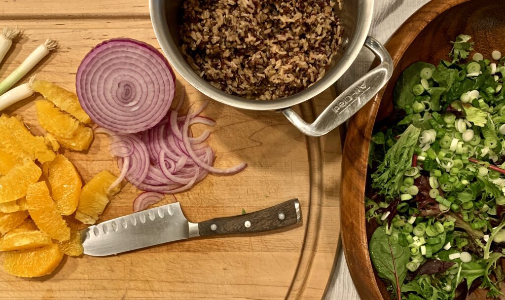 For an extra layer of flavor, cook the rice with broth and stir in bit of orange juice while it steams. You can make the rice ahead of time – it’s wonderful added warm or chilled to the salad.