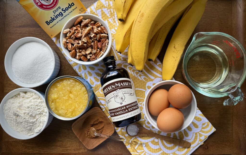 It’s actually an easy recipe to pull together. Whole eggs add richness to the cake accented by the fruity notes of crushed pineapple and fragrant, ripe bananas. Cinnamon and pure vanilla extract provide the perfect highlight with toasted pecans adding a glorious nutty bite.