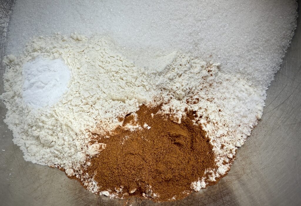 - Put the flour, sugar, baking soda, kosher salt, and cinnamon in a large mixing bowl. Blend on medium speed until the dry ingredients are mixed together, about 30 to 60 seconds.