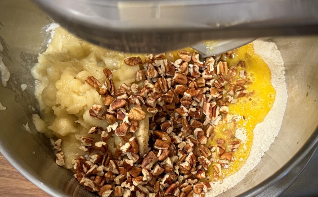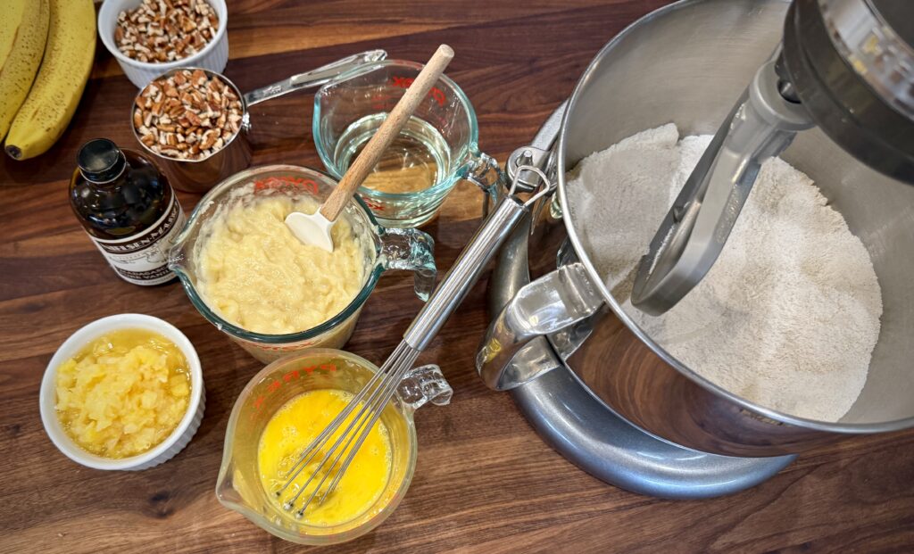 Lightly beat the eggs then add to the dry ingredients along with the vegetable oil, vanilla extract, crushed pineapple and any juice, the bananas, and toasted pecans.