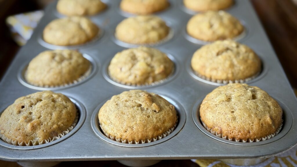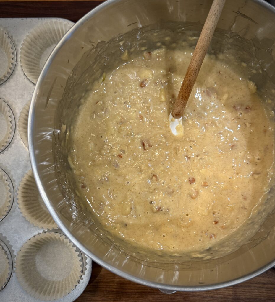 Mix on low speed just until the wet and dry ingredients are blended together, about 1 to 2 minutes. Line 24 to 26 cups in muffins tins with paper liners. Fill the cups about ¾ full. Using a large ice-cream scoop is an easy way to tackle this task.