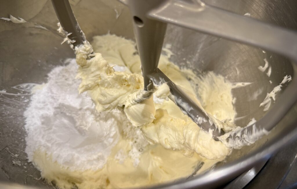 - Add the powdered sugar, about 1 cup at a time starting on low speed, then blending in on medium speed.