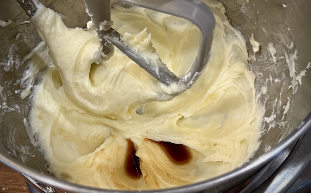 - Add the vanilla with the last cup of powdered sugar, scraping down the bowl as needed. Use the last ½ cup of powdered sugar if needed for a stiffer frosting.