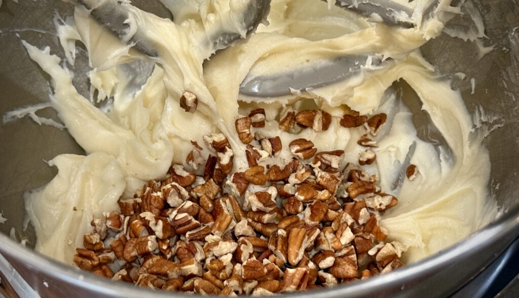 Toss in the toasted pecans blending into the frosting on medium speed.