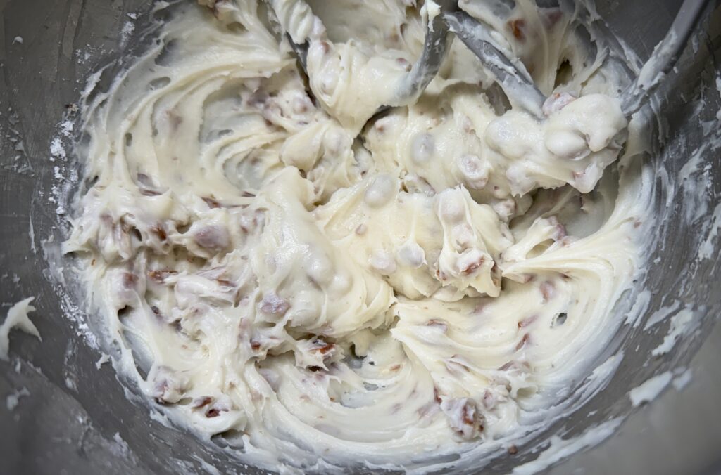 - Toss in the toasted pecans blending into the frosting on medium speed.