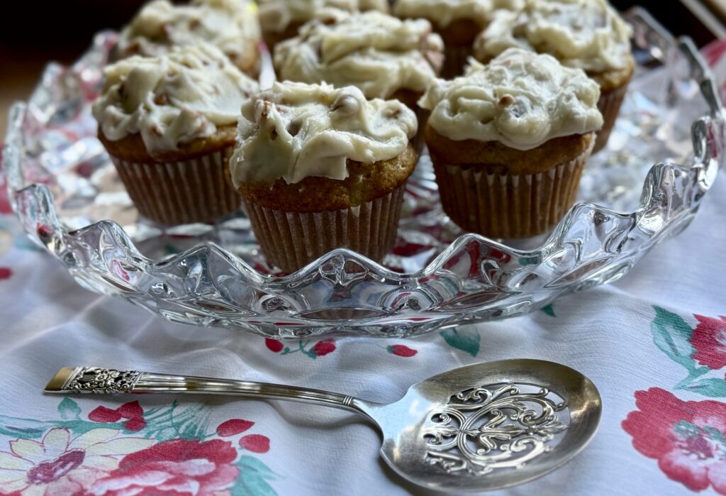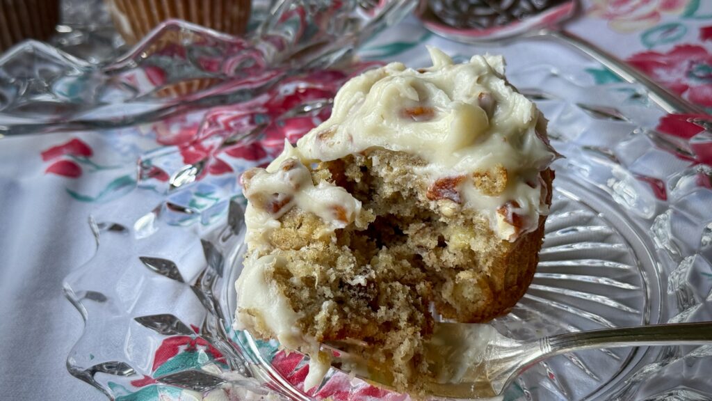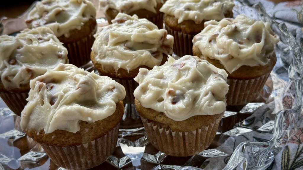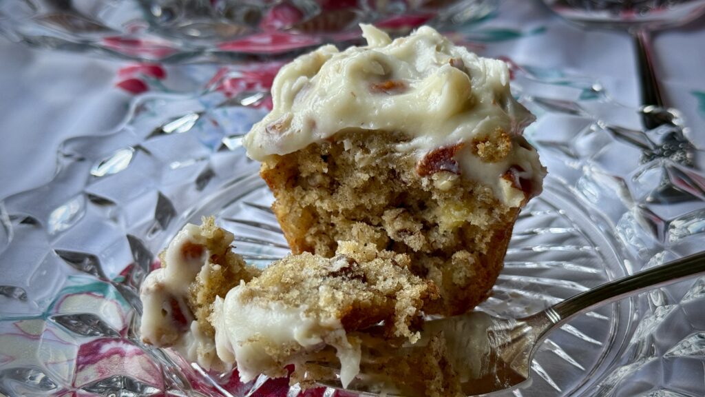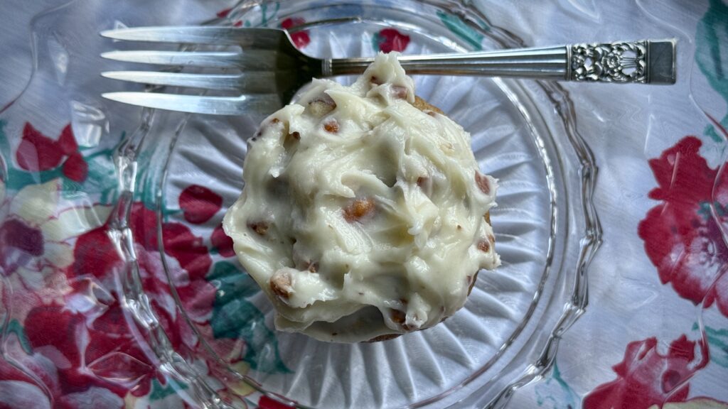 The cupcakes are wonderful on their own but let’s top them with a luscious cream cheese frosting – full of vanilla and more toasted pecans – simply luscious!