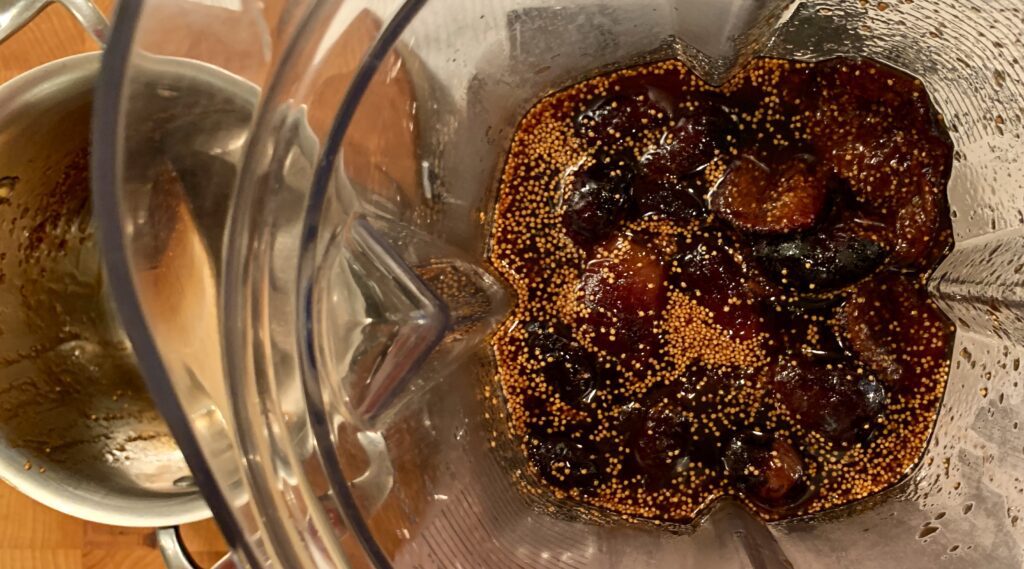 The figs are cooked with the orange zest, orange juice, sugar, and balsamic vinegar until they’re soft and the syrup is thick, then puréed until smooth.