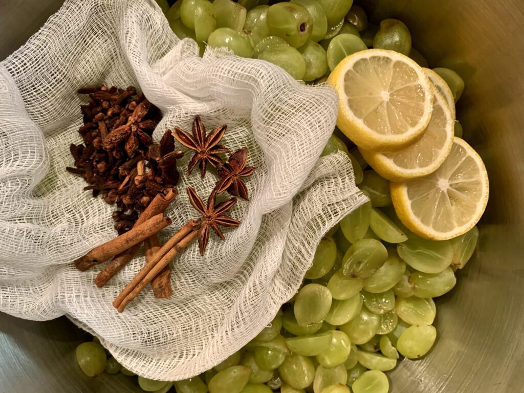 Remove the spice bundle from the kettle and when it’s cool enough to handle remove the spices. Divide them between 5 clean and sterilized pint-size jars. Ladle the grapes into the jars, making certain that each jar has a slice of lemon. Fill the jars leaving about ¼” headspace if you’re planning to can them in a water bath.