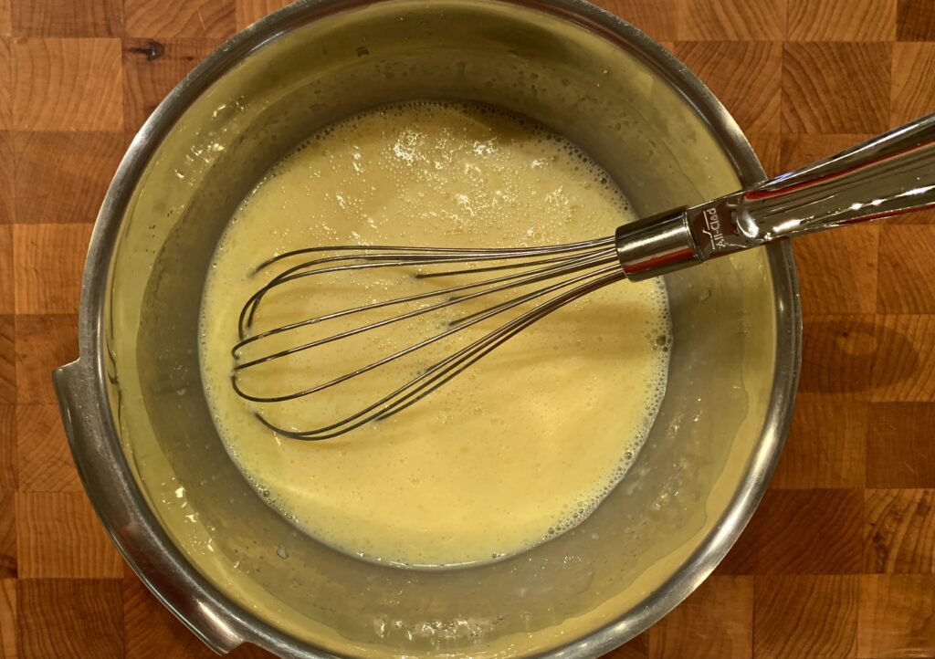 - Add the milk and the melted butter, whisking to blend together with the eggs.