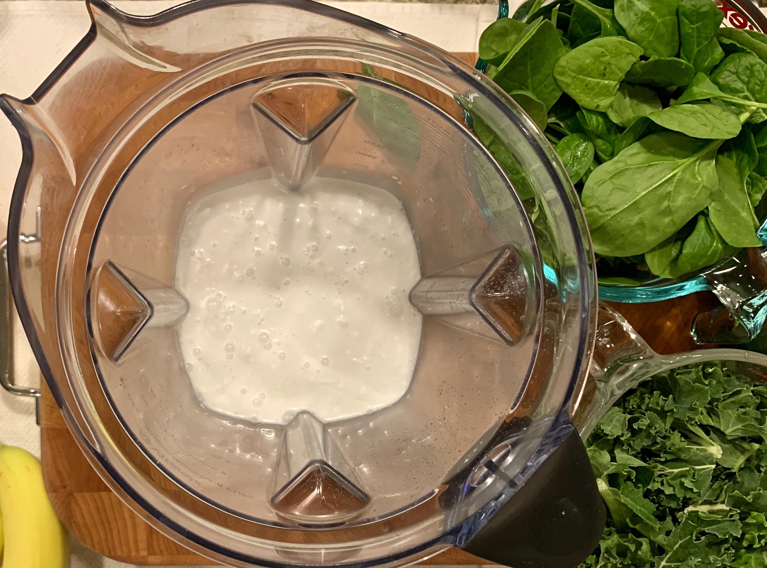 - Pour the coconut milk into the canister of a blender. Add the kale and the spinach then process starting on low speed for about 20 seconds, raising the speed to medium, blending until fairly smooth.