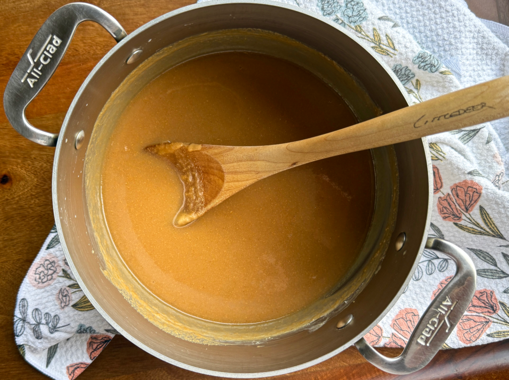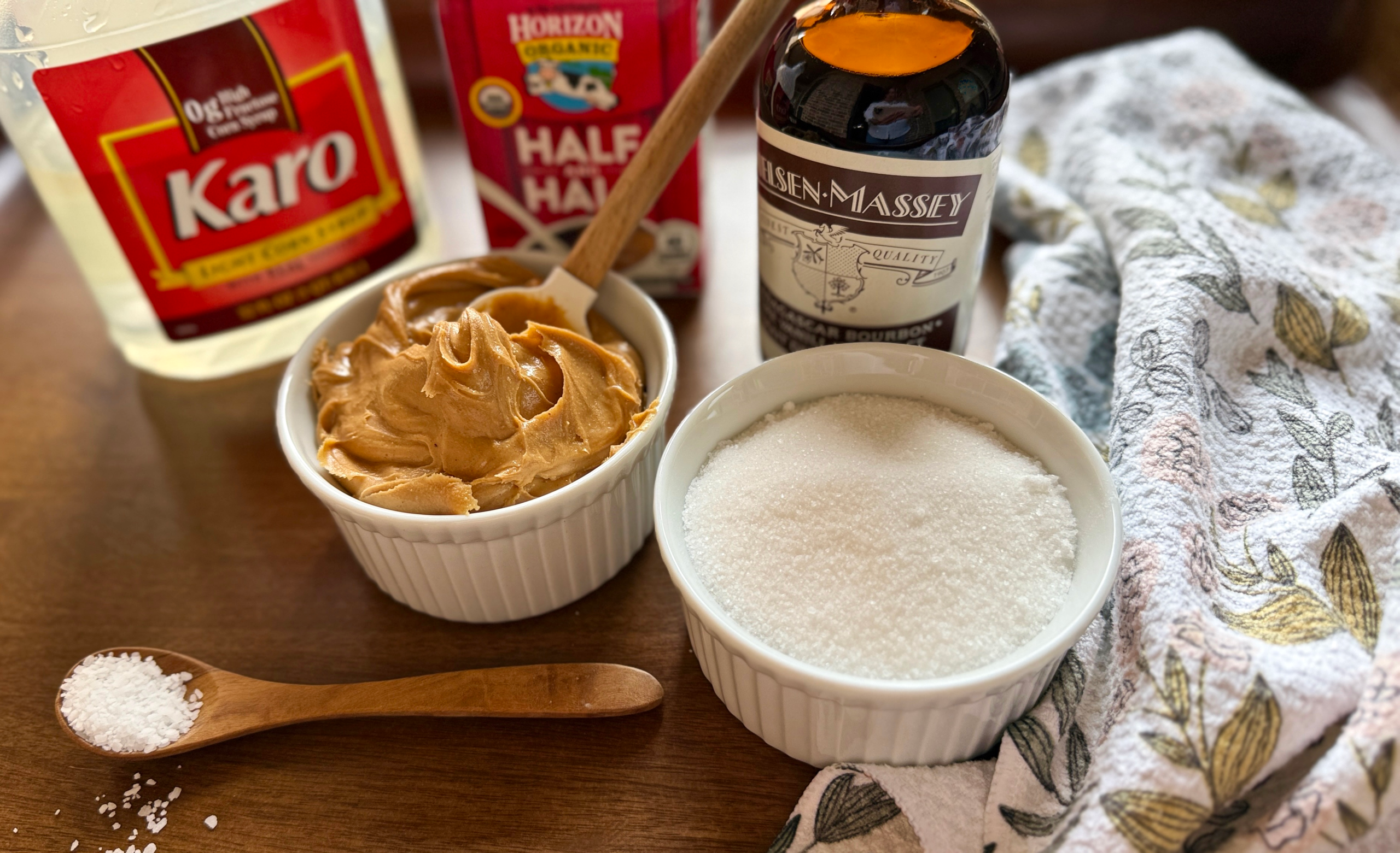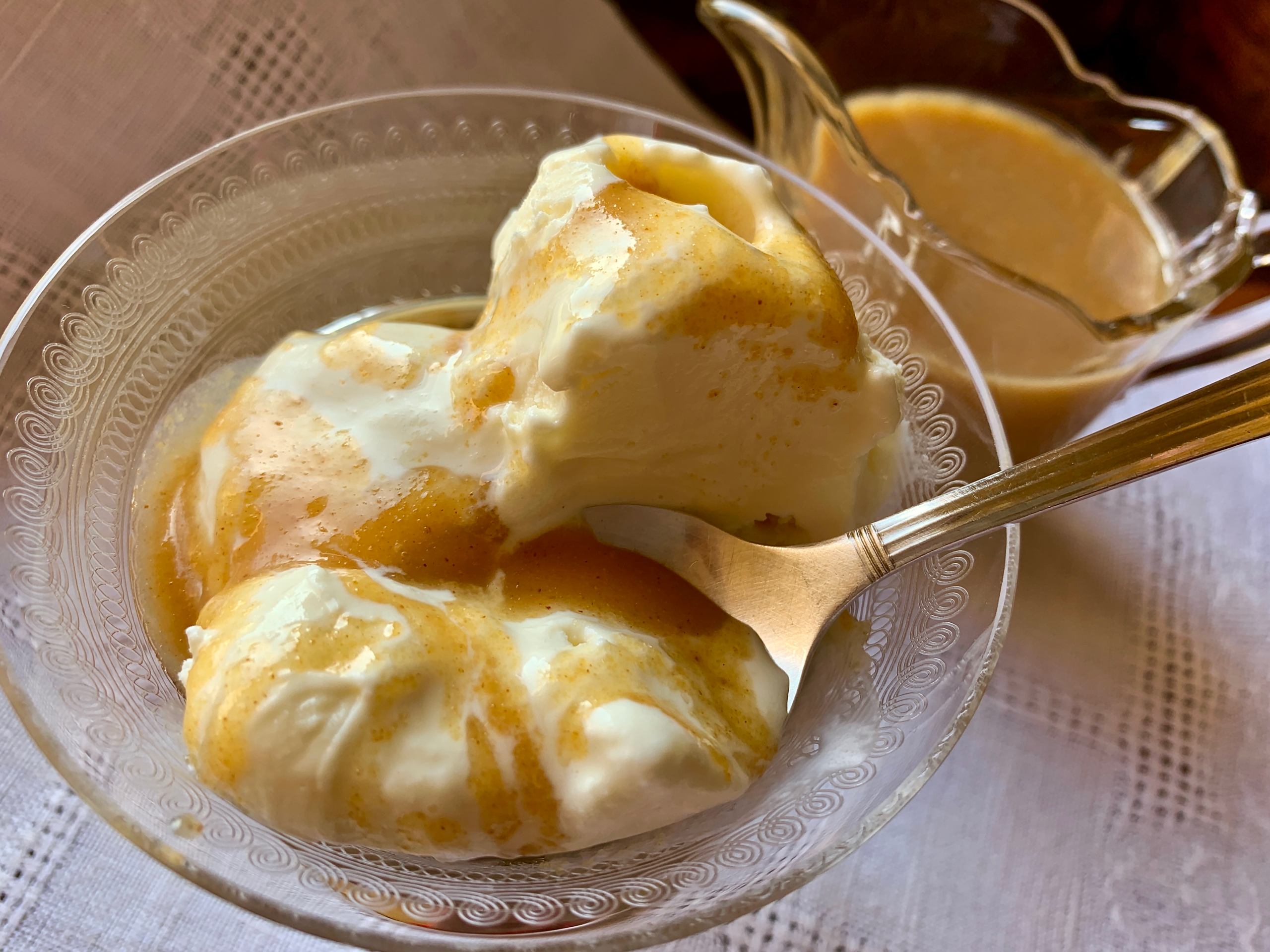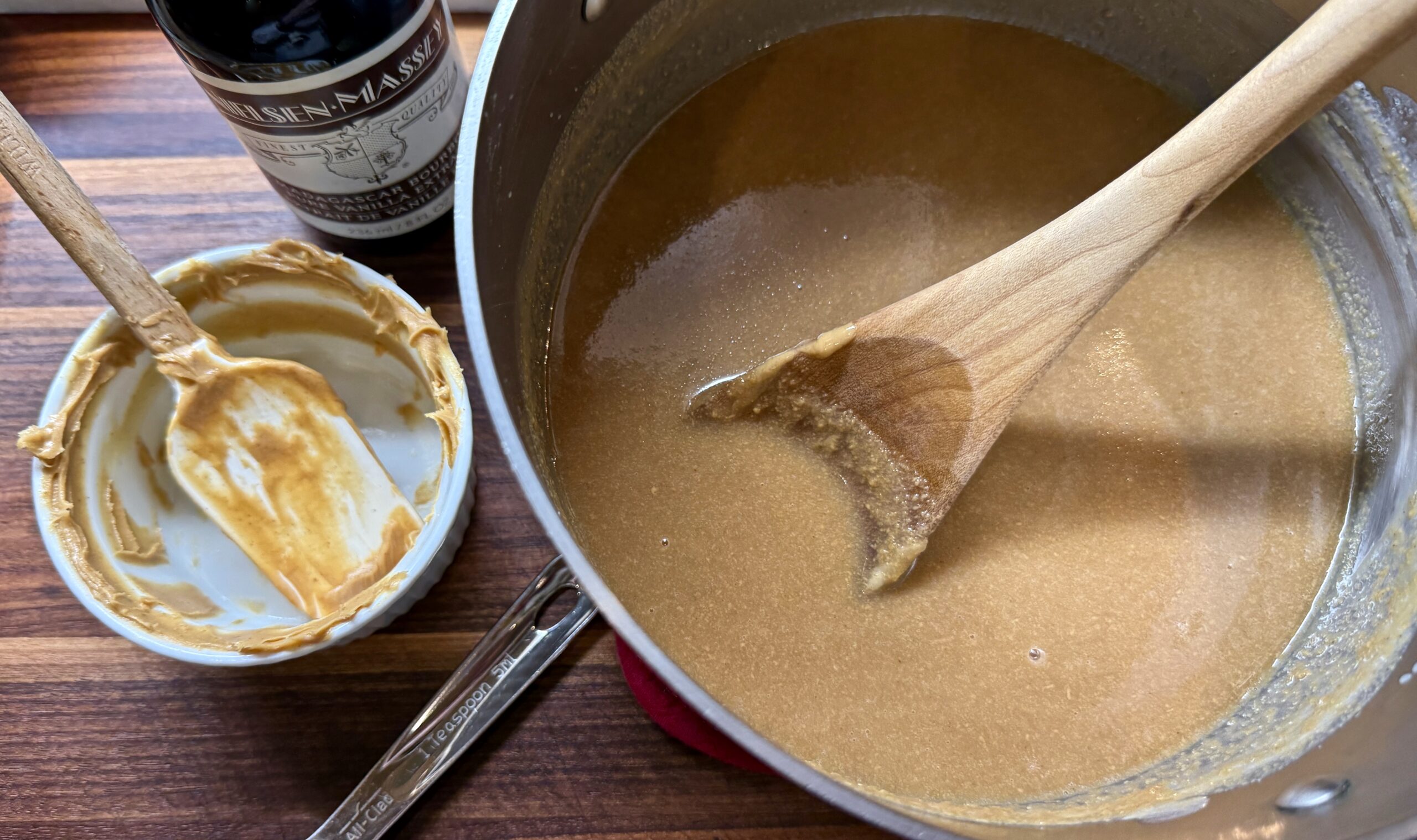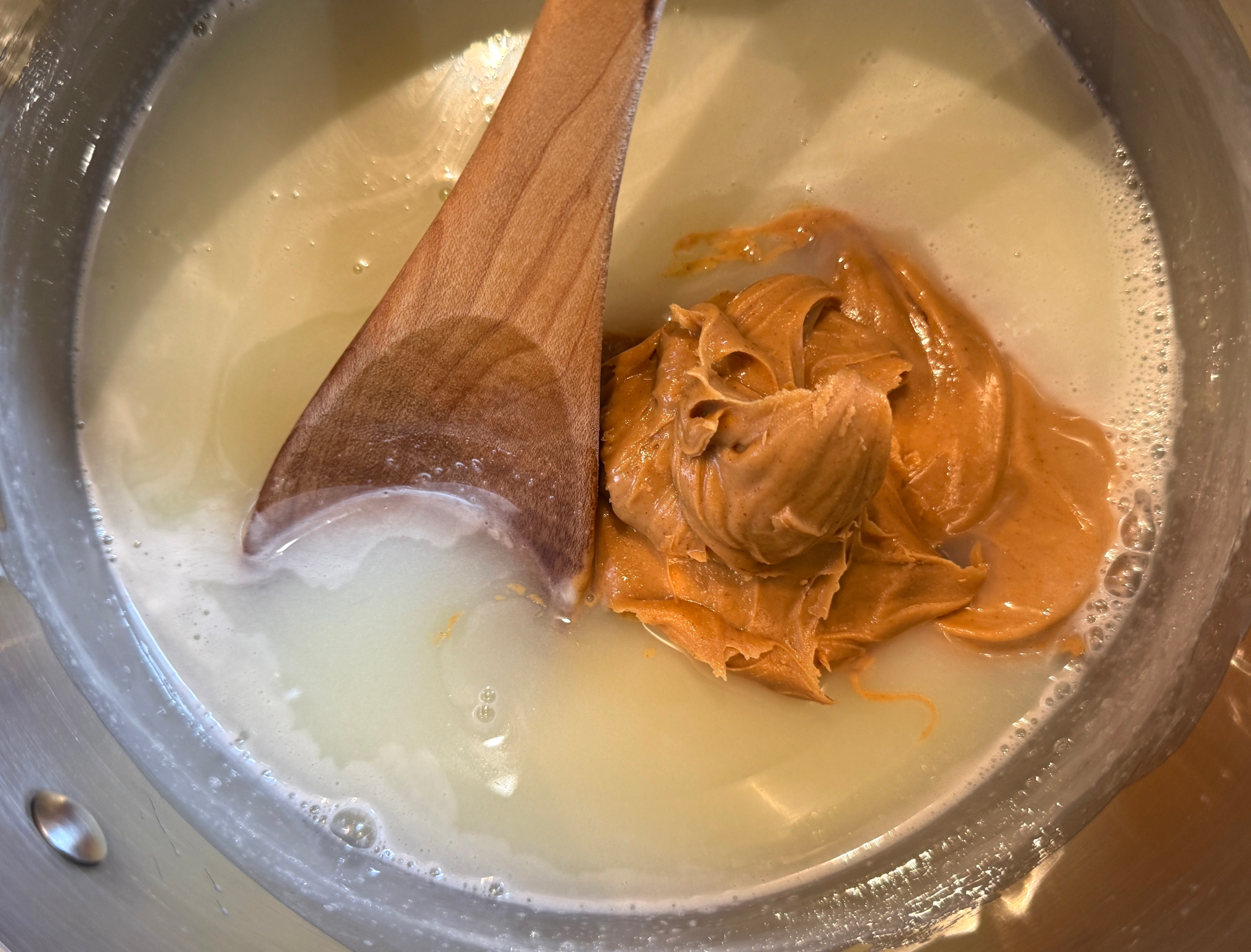 Some years back we hosted a birthday dinner for a dear friend with a unique passion for vanilla ice cream and peanut butter. I wondered if I could turn this flavor combination into a dessert suited for the celebration. Searching through one of Mom’s books, circa 1957, I found the perfect recipe. This luscious sauce starts with sugar plus a touch of Karo syrup – to keep things smooth – a pinch of kosher salt all stirred into half and half for that touch of creaminess.