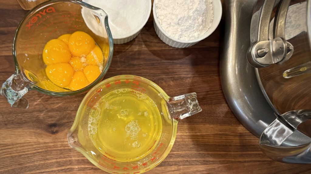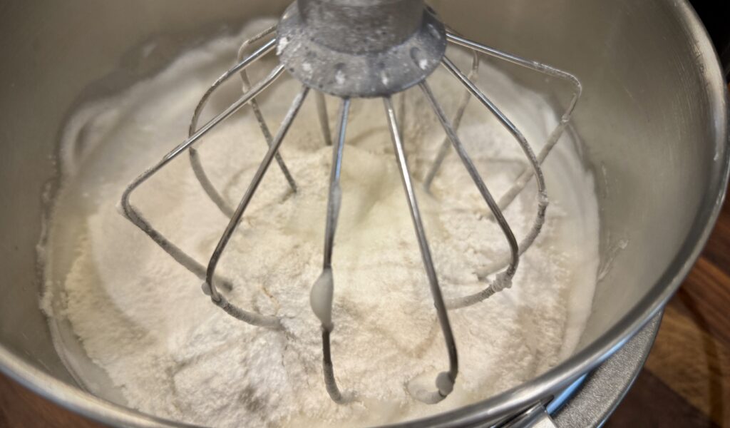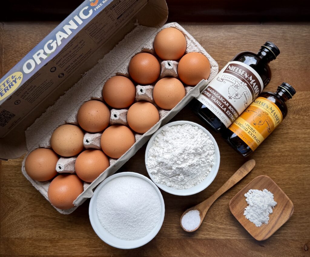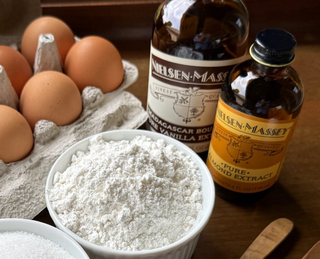 Most pantries have everything needed to make this delectable cake except maybe the cake flour – which is a must. Cake flour is finely milled and has a lower protein content than all-purpose flour. Start with whipped egg whites – they create that airy lift – whisked with a bit of cream of tartar to stabliize them. Add a touch of sweetness from sugar, then pure vanilla and almond extracts deliver a delicate bite.