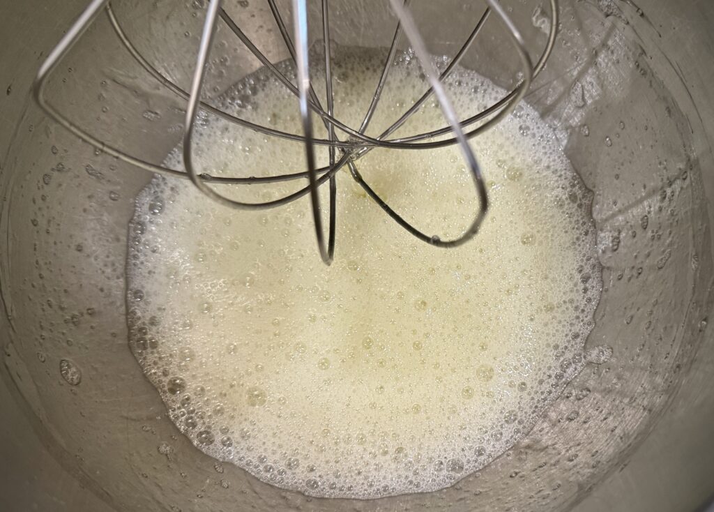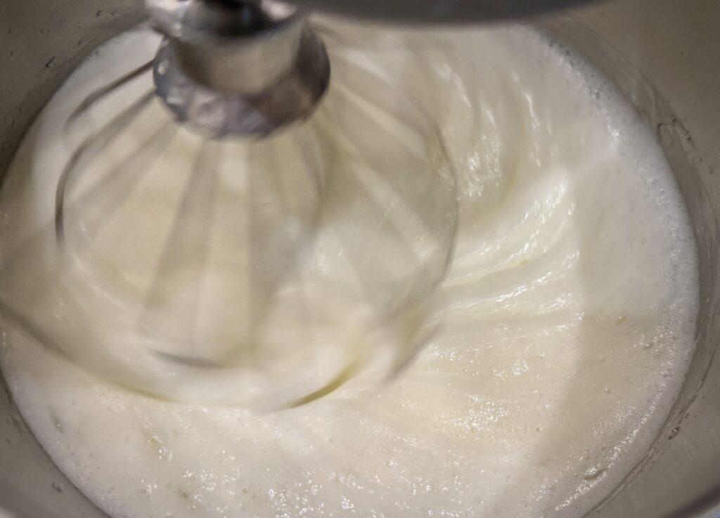 - Combine the egg whites with the kosher salt in a large mixing bowl. Beat using the whisk attachment on medium-high speed until the egg whites are foamy.