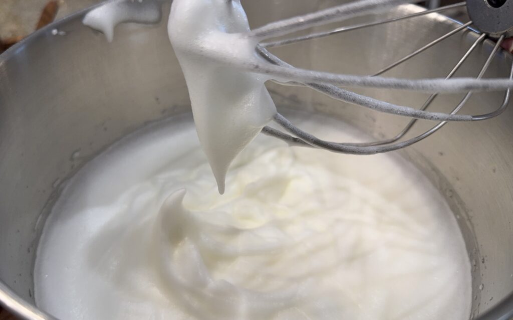 - Add the cream of tarter and continue beating until soft peaks form – about 2 to 3 minutes. Do not beat until the egg whites are dry or they will “break”.