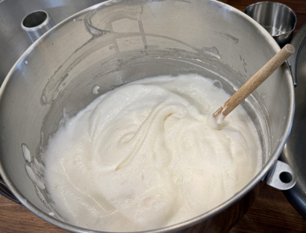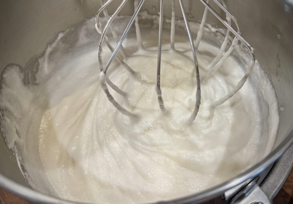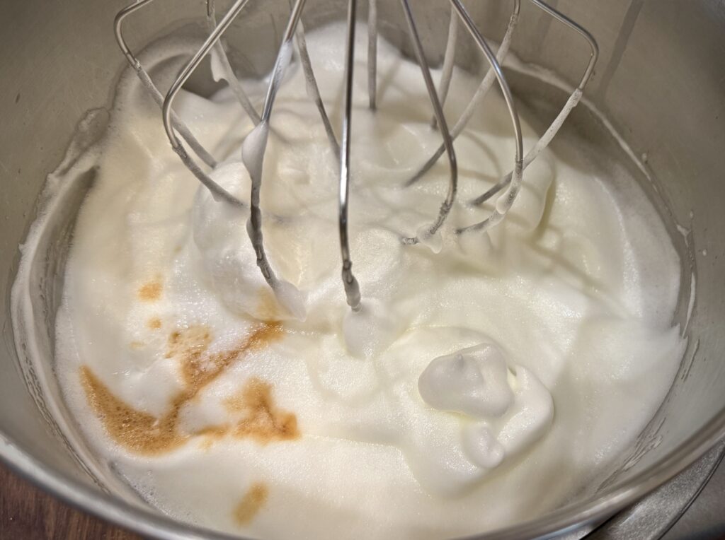 Add the cream of tarter and continue beating until soft peaks form – about 2 to 3 minutes. Do not beat until the egg whites are dry or they will “break”. Slowly pour in the remaining 1 cup of sugar and beat into the egg whites on low speed. Scrape down with a spatula to make sure all the sugar and egg whites are well blended.