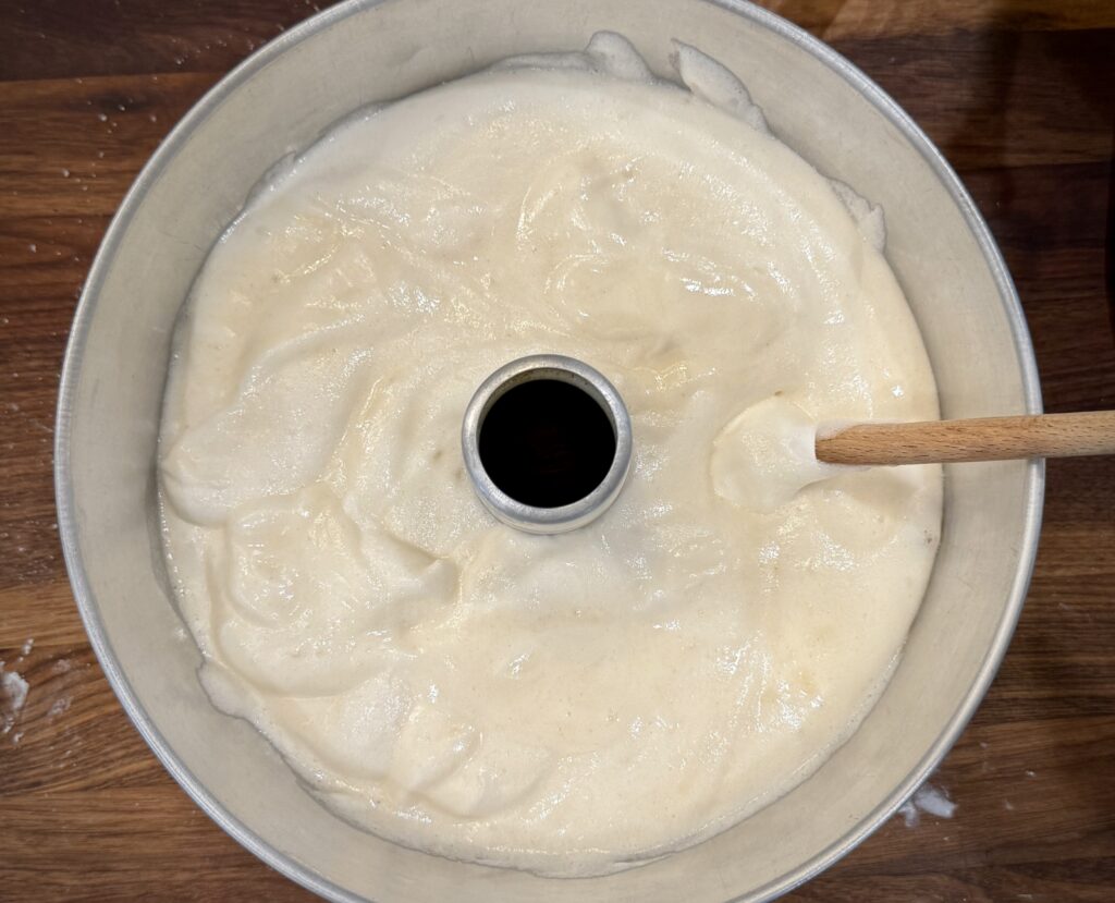 Pour the batter into an ungreased tube pan (one with a removable bottom). Use a spatula or knife and run it through the batter 2 to 3 times to break up any air bubbles.