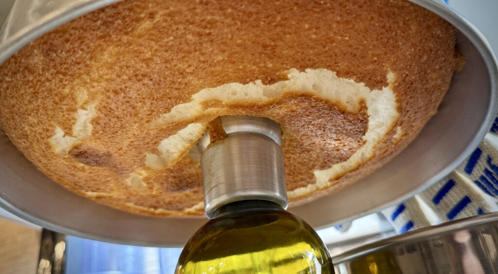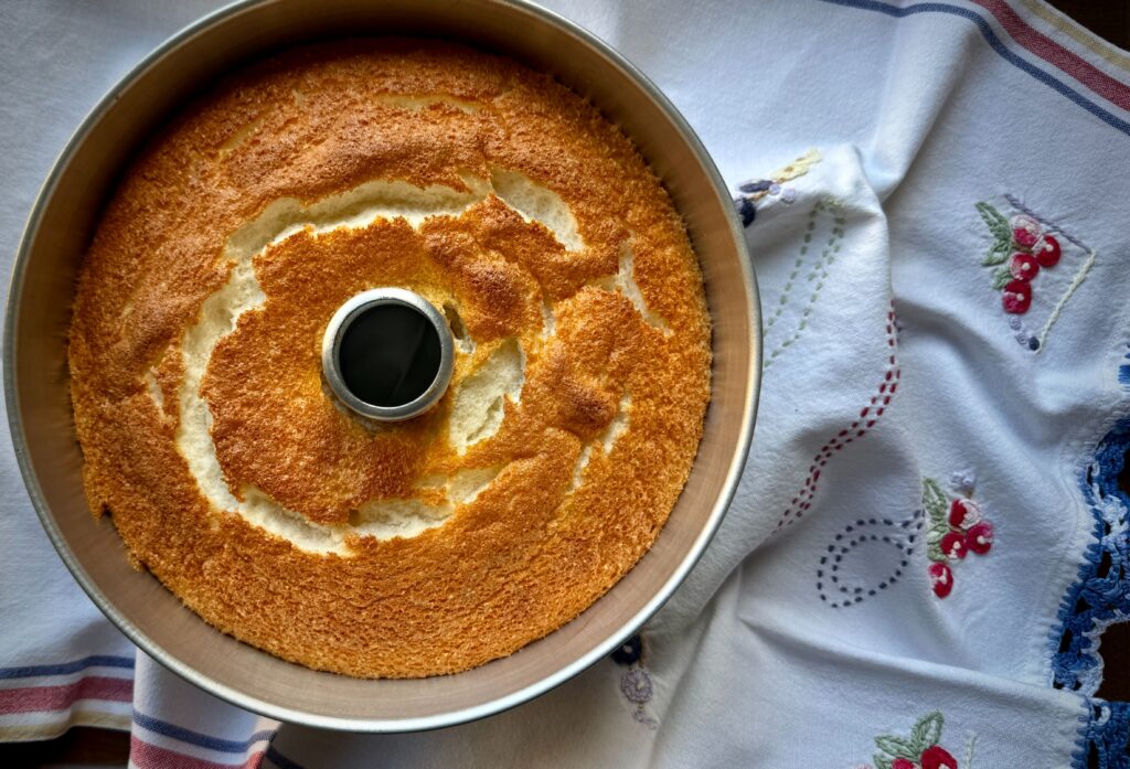 Bake the cake in a 375-degree oven, placed on the rack just slightly below the middle. Bake for 30-35 minutes or until the “cracks” appear dry. Do not open the door until the cake is done. Remove and immediately invert the cake. If your pan doesn’t have supports a wine bottle works well for this – just check that it fits on the neck of the bottle first.