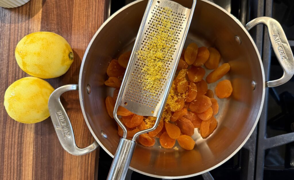 Toss the dried apricots in a medium saucepan with the lemon zest, lemon juice, and water.