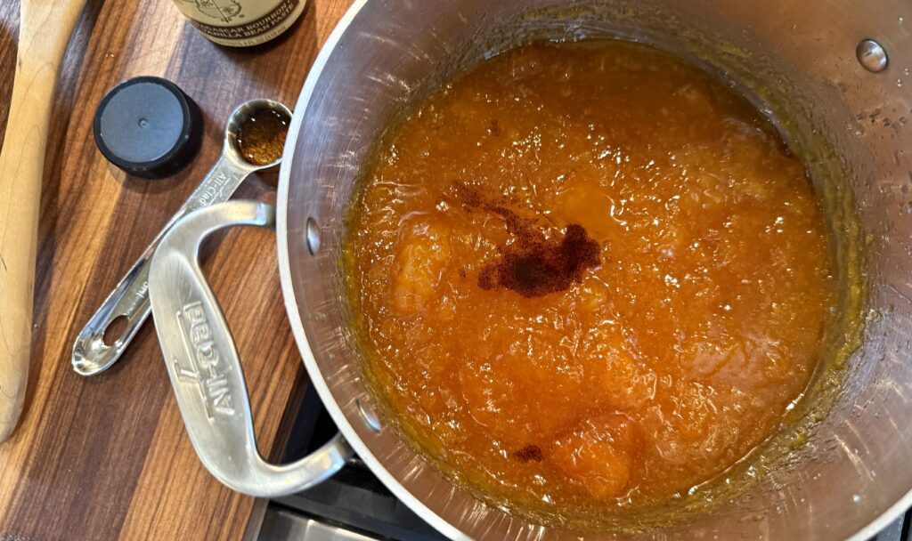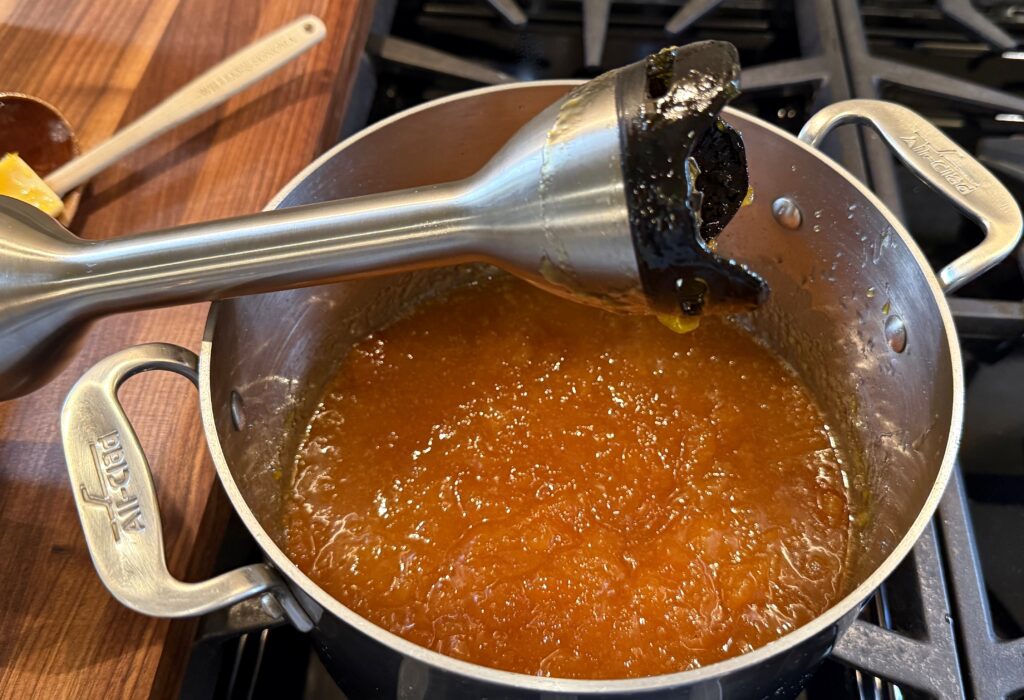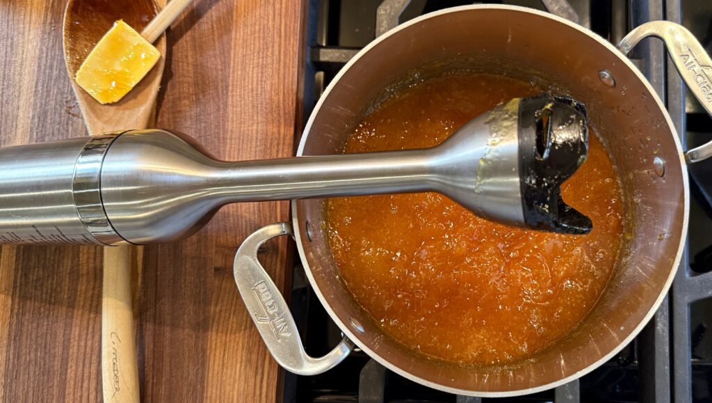 Let the apricots cool for about 10 minutes then using an immersion blender, purée the apricots until somewhat smooth in texture.