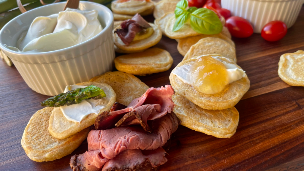 Forget the charcuterie board, set out a spread of these tiny pancakes and let your guests create to their own delight!