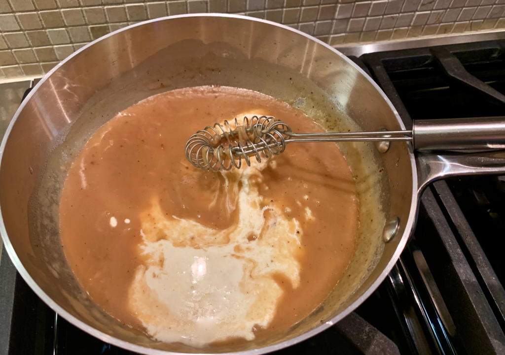 For the gravy, shallots are sautéed in butter adding their subtle, savory note to a rich beef stock creating a luscious brown sauce.