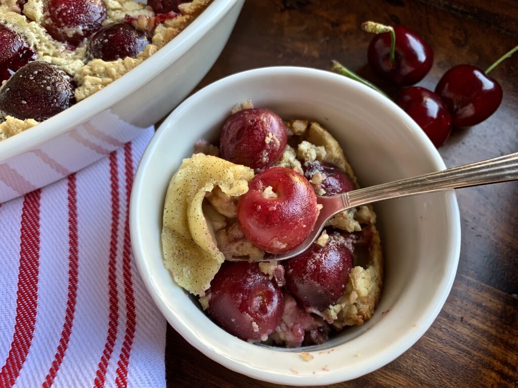 It’s the perfect place for a favorite summer fruit to hide out – baked inside a rich, luscious vanilla custard! With a light layer of crunch from toasted almonds these sweet, plump cherries are all dressed up nestled in a dessert that’s utterly delectable, ridiculously easy and ideal for easy entertaining!