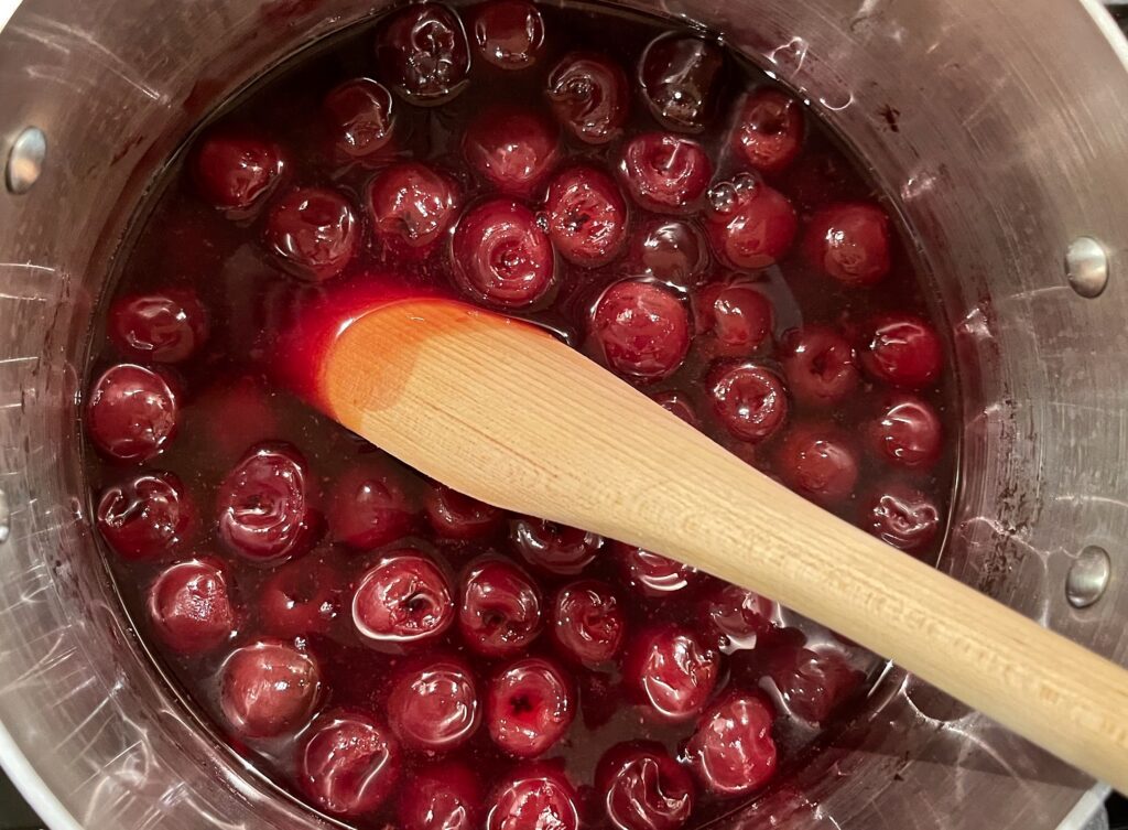 Stir in the pitted cherries, cover the pan, reduce the heat to low and continue to cook for 30 minutes.