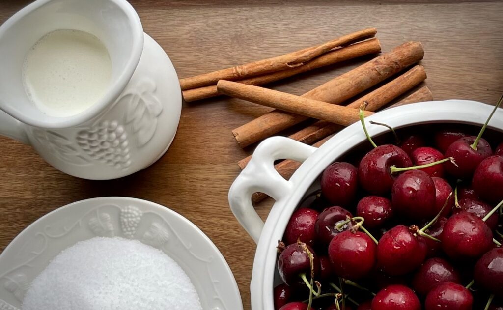 We love to entertain so I’m always reading cookbooks, trying new recipes or reviving old ones. This dish falls in the “old recipe” category and reportedly comes with Hungarian or Polish roots. Cold soups offer a wonderful change of pace. Start by tossing cinnamon sticks into a simple syrup base then use it to cook the fresh cherries. A touch of cornstarch brings a silkiness to the soup, finished with a bit of cream and a pour of fruity red wine.