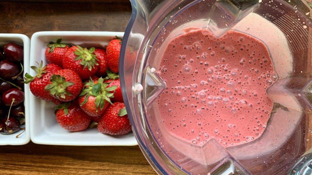 You can start with fresh fruit and freeze it yourself. Or grab a bag of organic frozen cherries and strawberries from the freezer at your favorite market to make life even easier. In no time you’ll have one luscious drink – and one for a friend.
