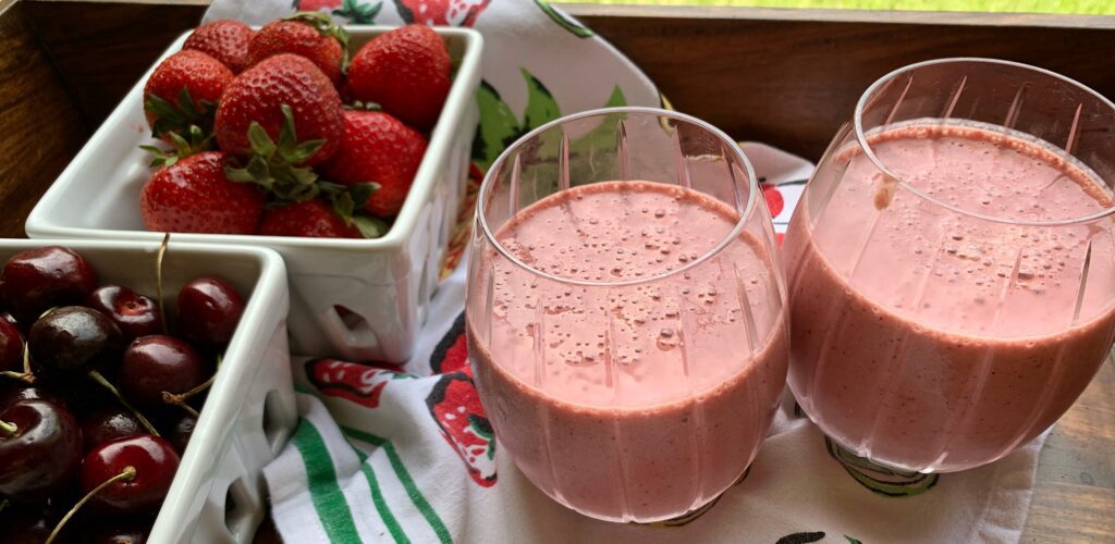 Plump cherries swirl with red, ripe strawberries and creamy yogurt offering up a delicious treat for a morning or afternoon refresh! Here’s a glorious drink full of summer’s sweetest fruits – and as delightful to the eye as it is to your tastebuds!