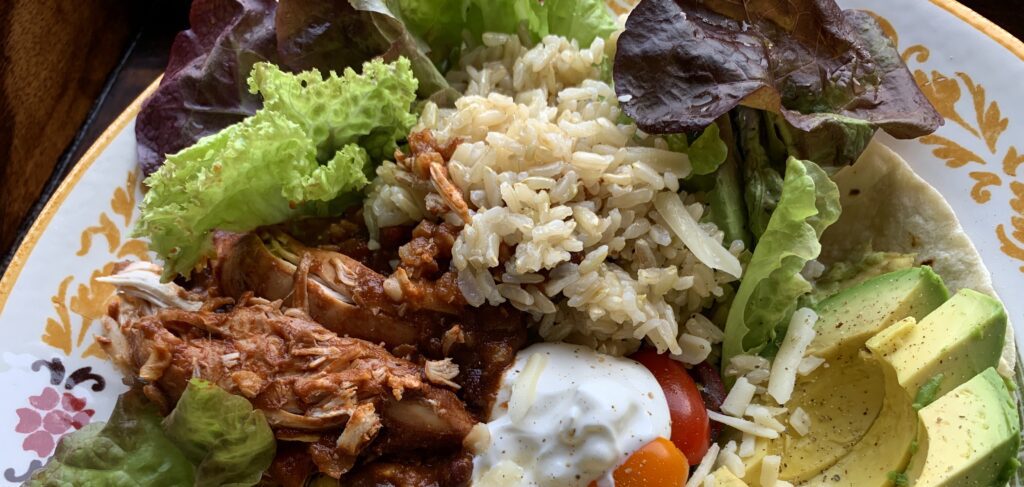 Tuck a warm tortilla tucked inside a large bowl and pile on chunks of chicken. Layer with more brown rice, roasted corn, fresh field greens and tomatoes along with avocados, a sprinkling of cheese and a dollop of sour cream!