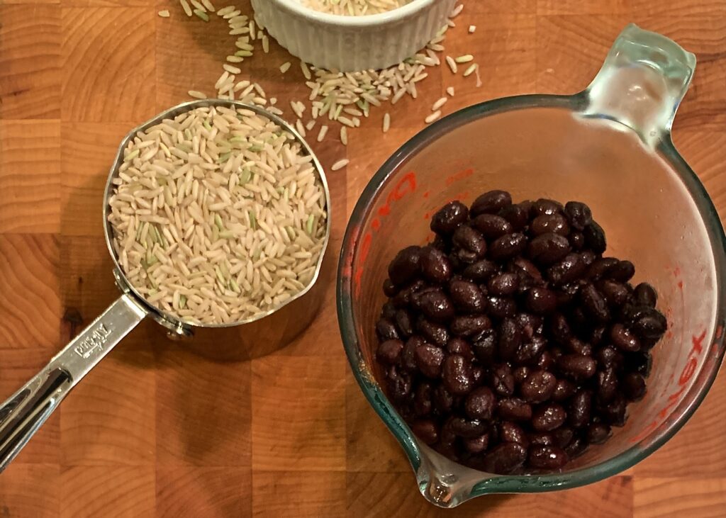 - Add 1 cup of the brown rice and the black beans then switch the setting to high. Continue cooking for about 1 to 1-½ hours or until the rice is tender.