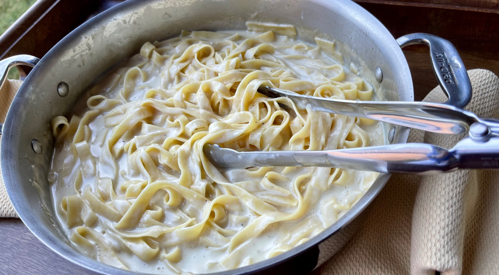 Once the pasta is tender, ladle the Alfredo sauce into the pan with the pasta, tossing to coat as you go, adding more as needed to completely coat the pasta., reserving a small amount for serving. Toss in the Parmesan cheese, blending into the pasta.