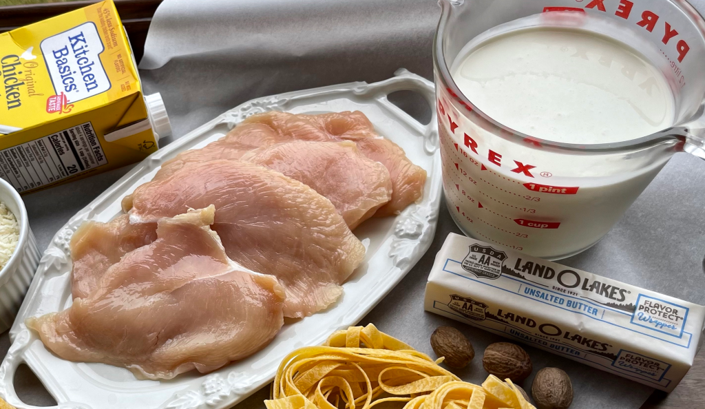 Stir in the kosher salt, grated nutmeg, and the black pepper. Keep warm on low heat while you cook the chicken and the pasta.