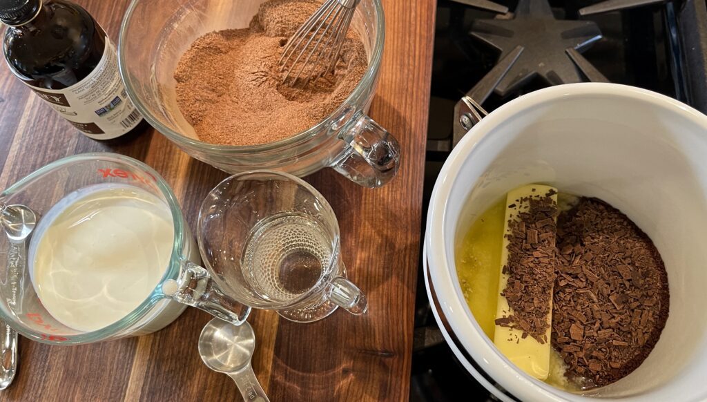 Cooking the sauce in a double-boiler helps prevent the chocolate from scorching. If you don’t have one, you can also place a heatproof mixing bowl over a pan of simmering water. Makes about 3 cups.