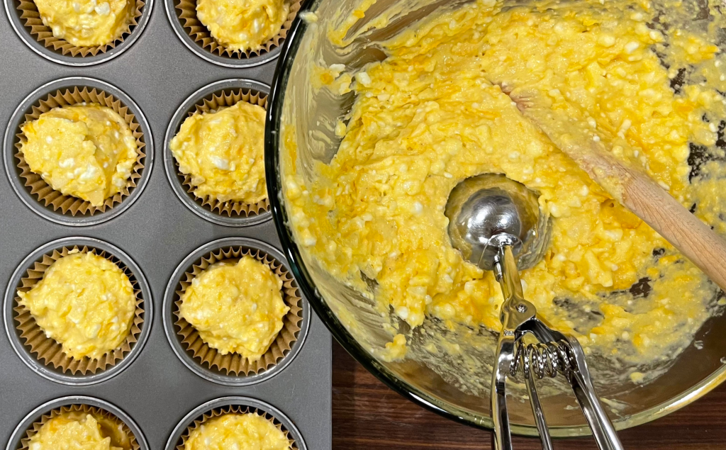 Give it a quick stir and you’ll have cornbread muffins that are utterly delightful. This is one of those wonderful “go to” recipes. The bonus, it makes two-dozen cornbread muffins, and they freeze beautifully!