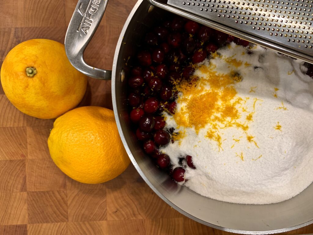 - In a large saucepan add the cranberries, along with the water, sugar, and zest from the oranges. Cook over medium-low heat until the sugar dissolves, stirring occasionally, about 10 minutes.