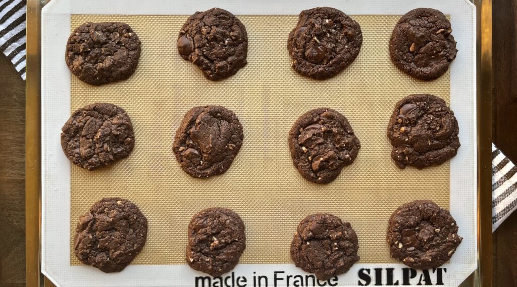 Drop the dough onto a baking sheet lined with a Siplat liner or parchment paper using a small ice cream scoop or a tablespoon. Leave about 2” between the cookies to allow them room to spread.