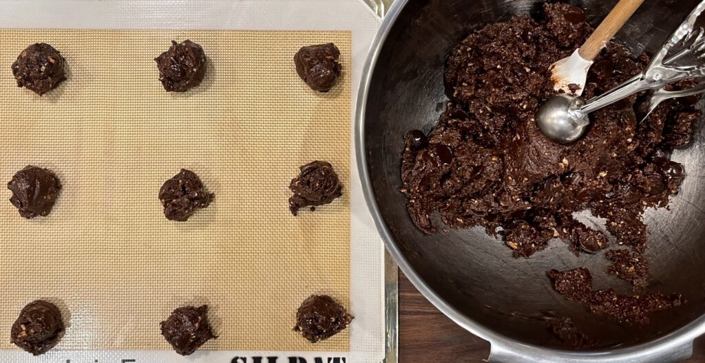 - Drop the dough onto a baking sheet lined with a Siplat liner or parchment paper using a small ice cream scoop or a tablespoon. Leave about 2” between the cookies to allow them room to spread.