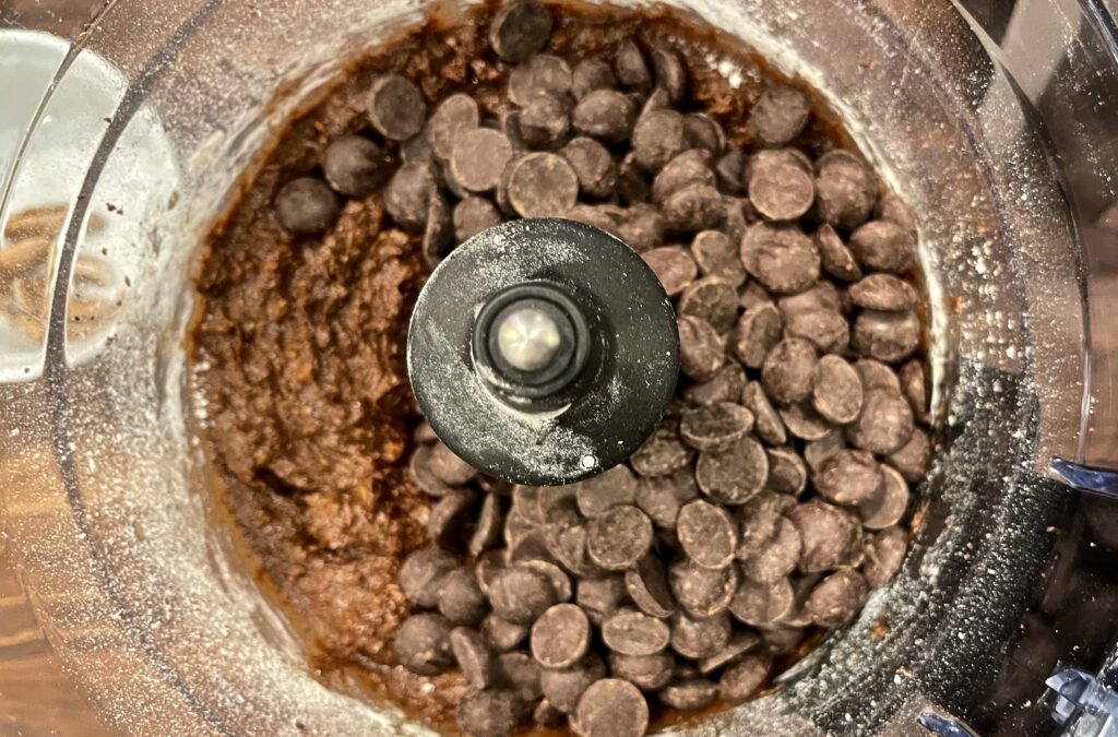 Preheat the oven to 350-degrees. Toss the chopped bittersweet chocolate into the bowl of a food processor along with both sugars.