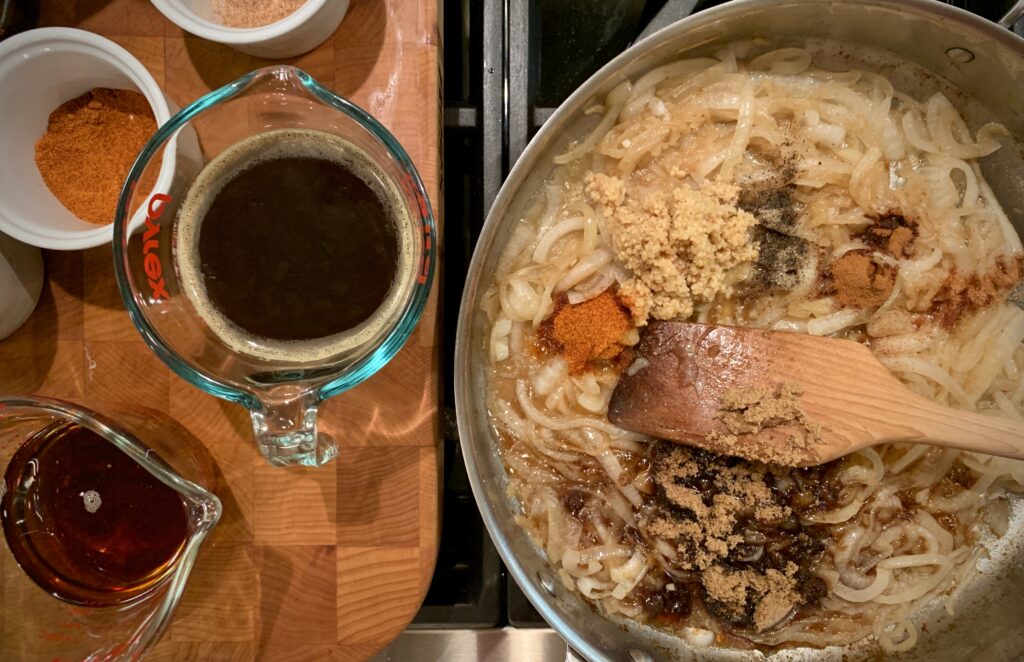 Pour the bourbon, coffee, vinegar, maple syrup, and chili sauce into the onion mixture. Add the bacon and stir to mix well.