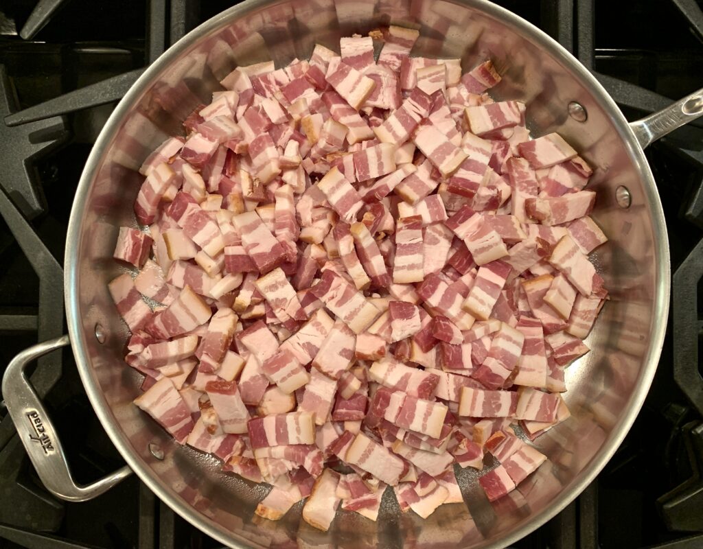 A few tips. Spread the bacon out allowing it to cook more quickly and evenly. Use a pan with a large surface area and also with some depth to it. A large, deep sauté pan or Dutch oven works really well. Don’t rush this step, you want the bacon crisp.
