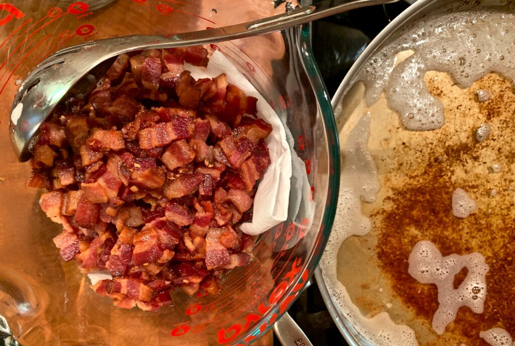 - Skim off the bacon drippings and reserve. Add about 4 tablespoons of the drippings back into the pan along with the onions. (Keep the remaining bacon drippings for other uses – they’re liquid gold!) Cook the onions over medium heat until they’re translucent and softened, about 8 to 10 minutes. Add more bacon drippings only if needed.