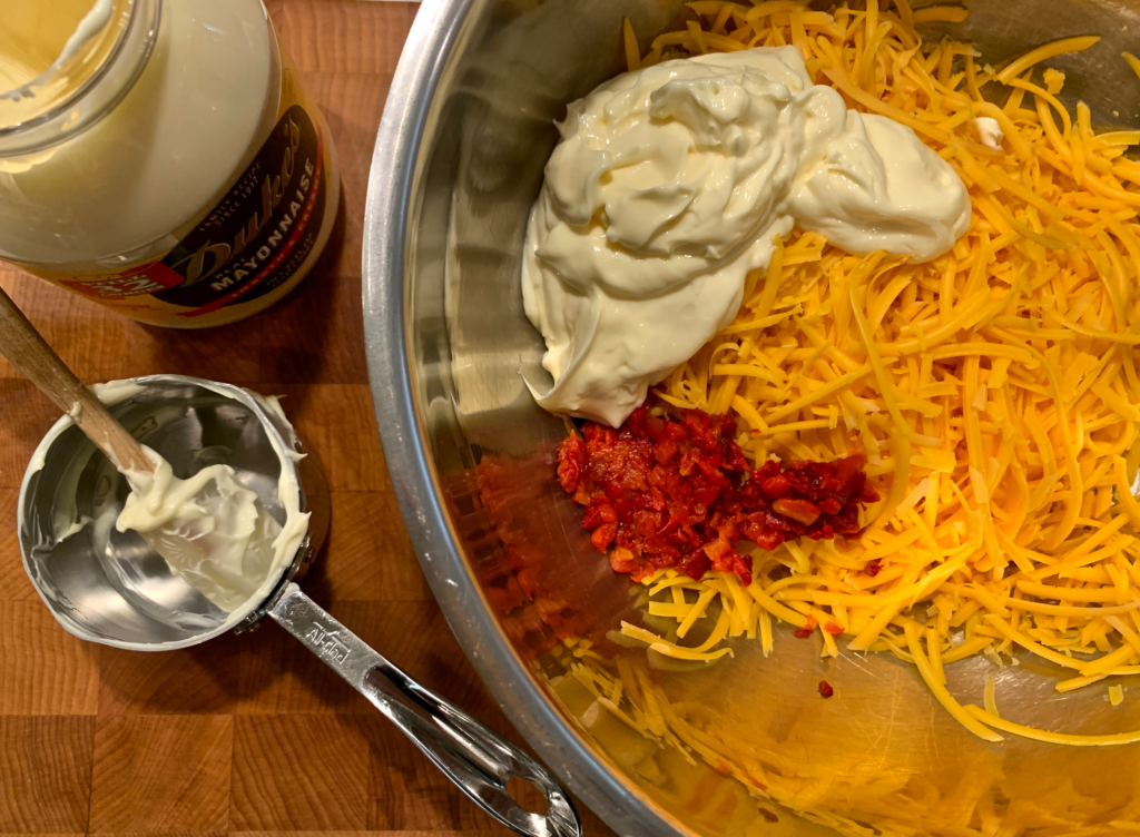 Transfer the pimentos to a chopping board and give them a rough chop and add to the shredded cheese. Add the mayonnaise along with the seasonings. Add more cayenne or chili powder if you like it a bit spicier.