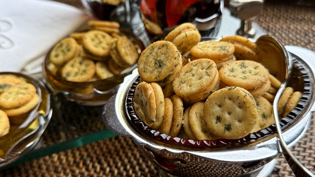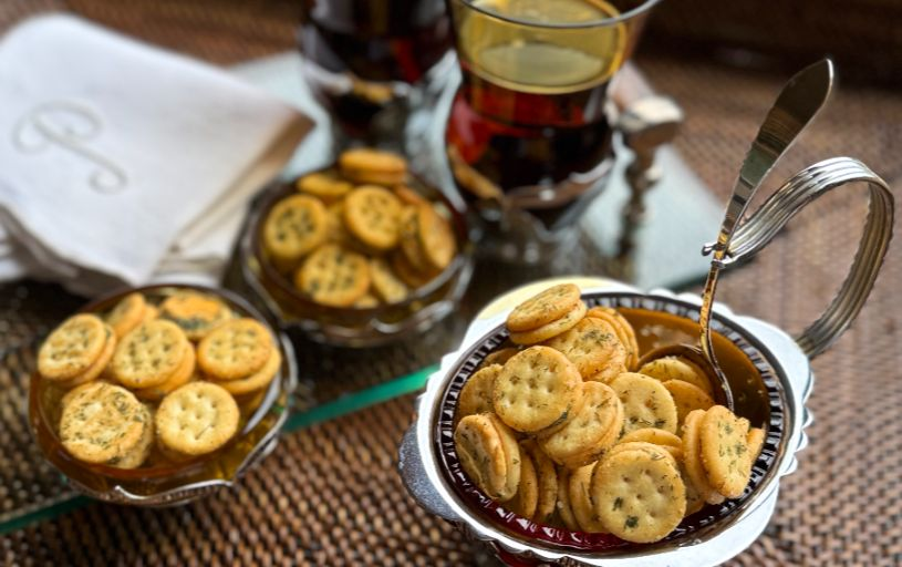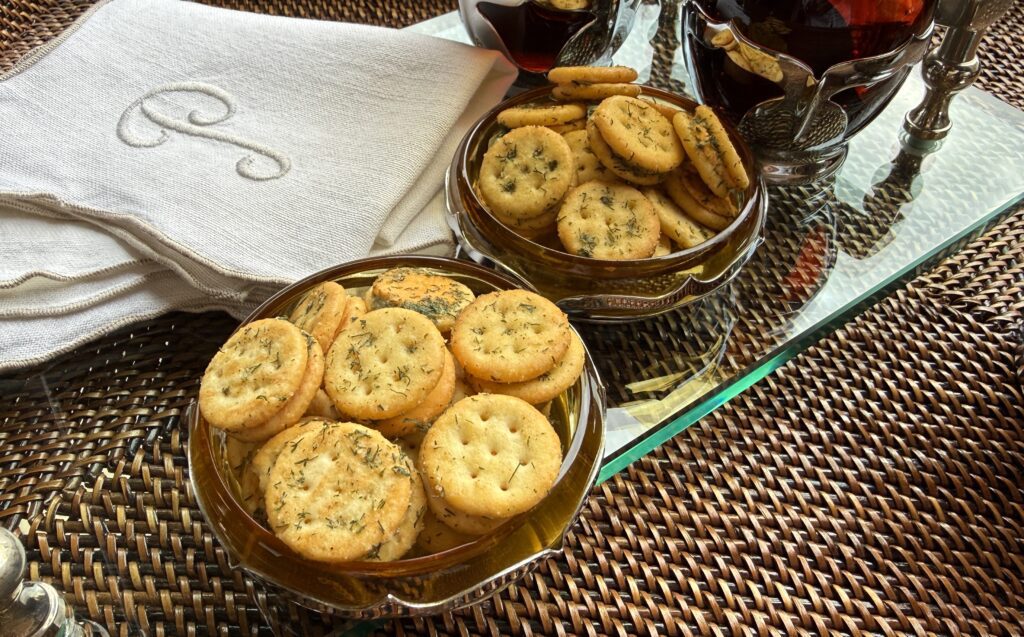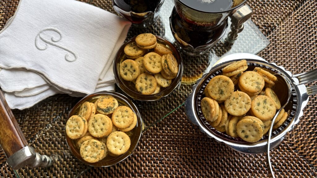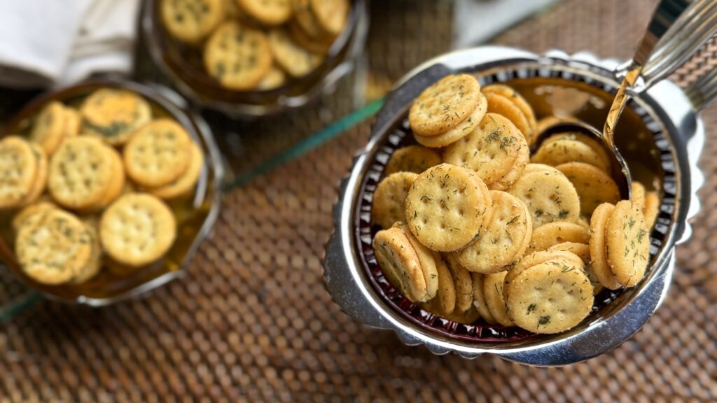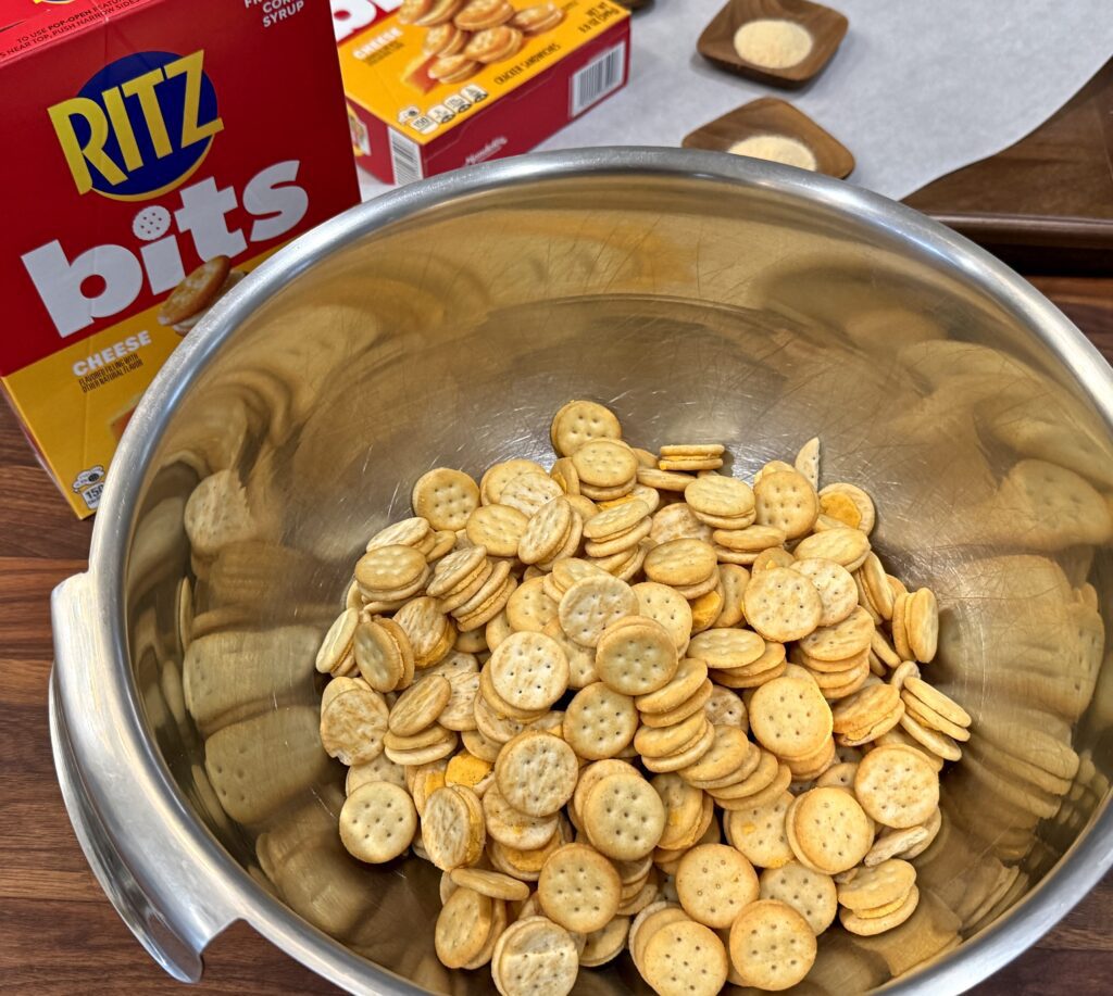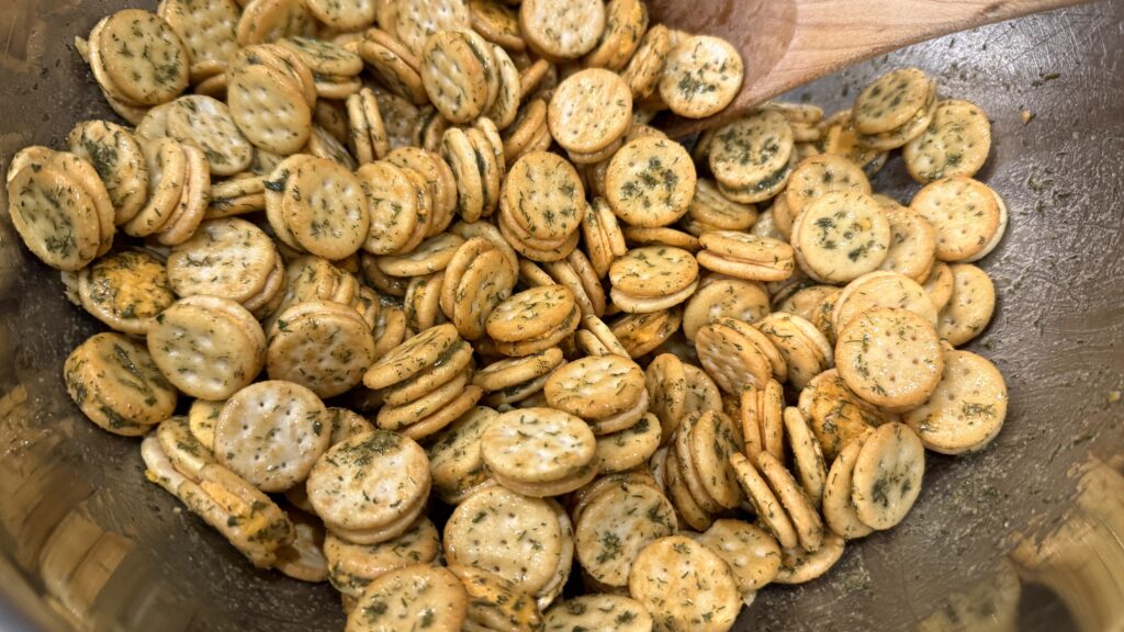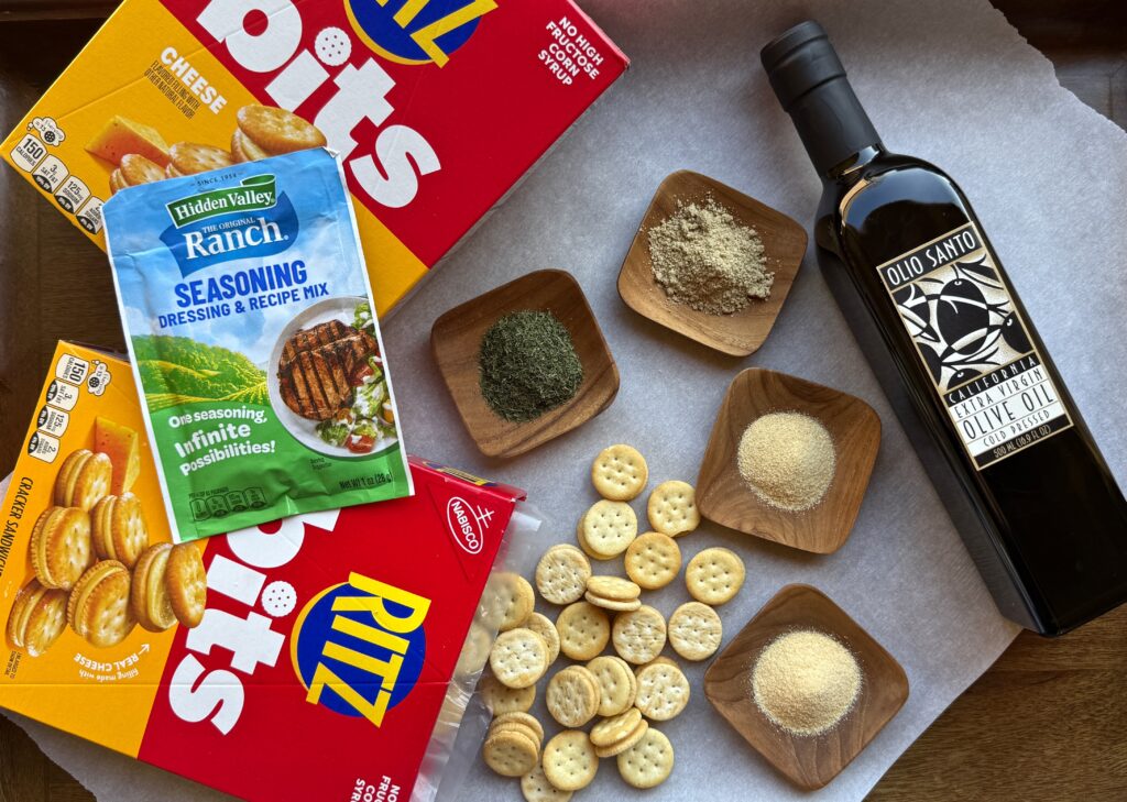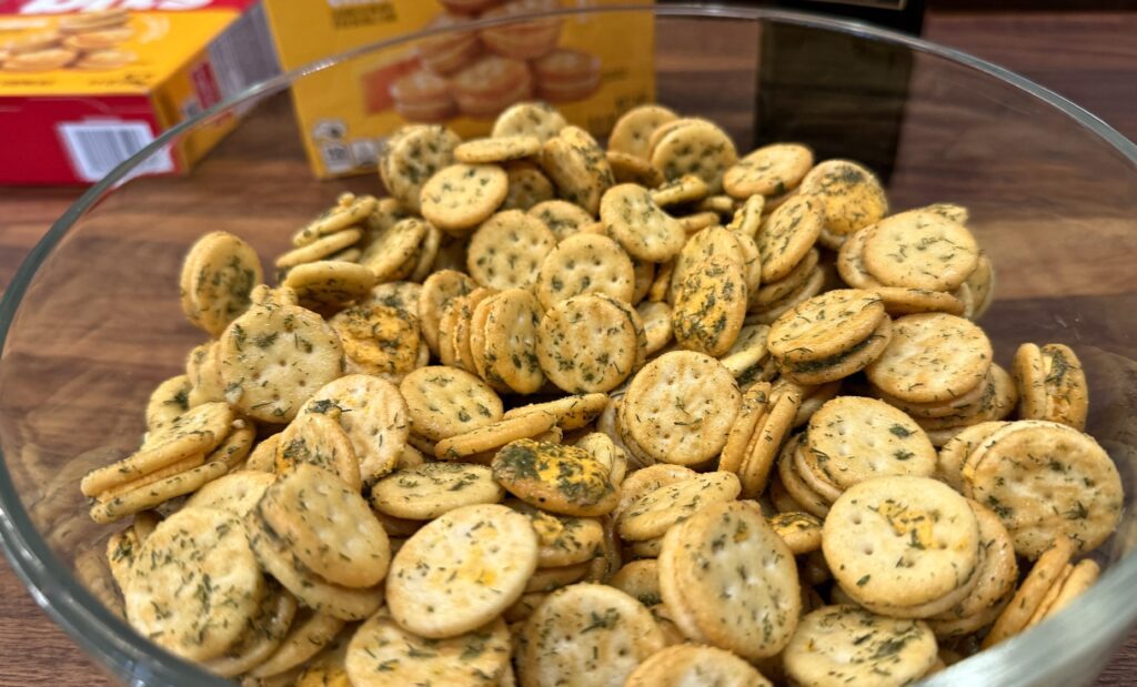 This is one such snack. No doubt we’ve all enjoyed those famous round buttery crackers – they’ve been around since the 1930s. But the little cheese bits are a more recent addition to that familiar brand and they lend themselves quite nicely to an extra dash of seasoning and herbs. All the ingredients are pantry staples that you might already have on hand – a packet of ranch dressing mix, dried dill, celery salt plus both garlic and onion powder and rich extra-virgin olive oil. Oh, and Ritz Bits Cheese Crackers.