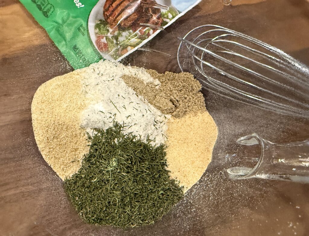 - In a separate mixing bowl whisk together the dressing mix with the dill, garlic powder, celery salt, and onion powder.