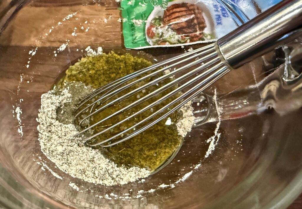 - Pour the olive oil into the herb and seasoning mix, whisking to blend together.