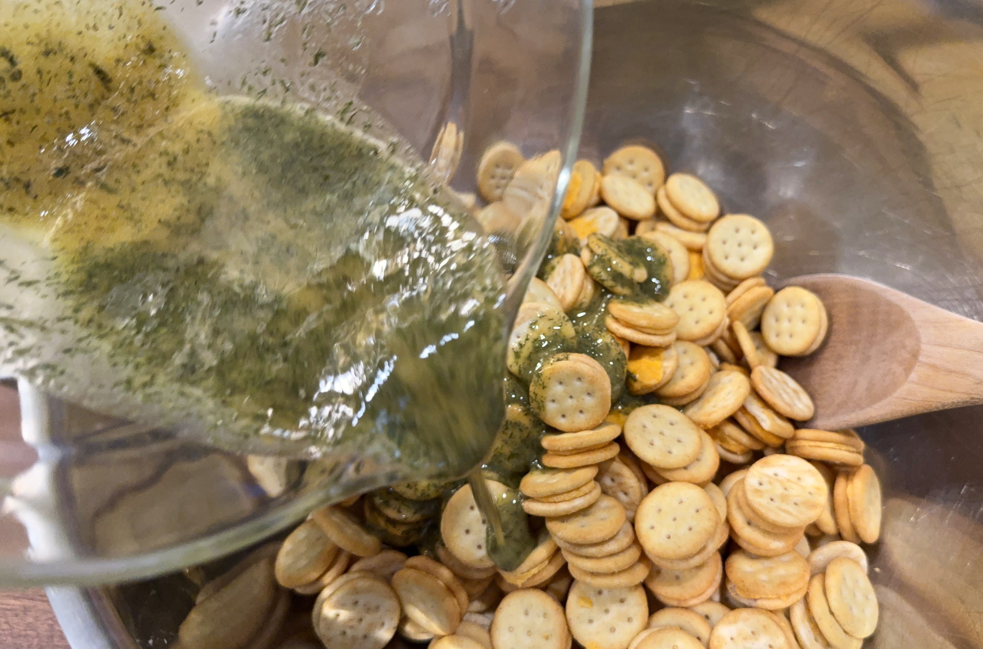 Drizzle the seasoning mixture over the crackers and stir to coat well.