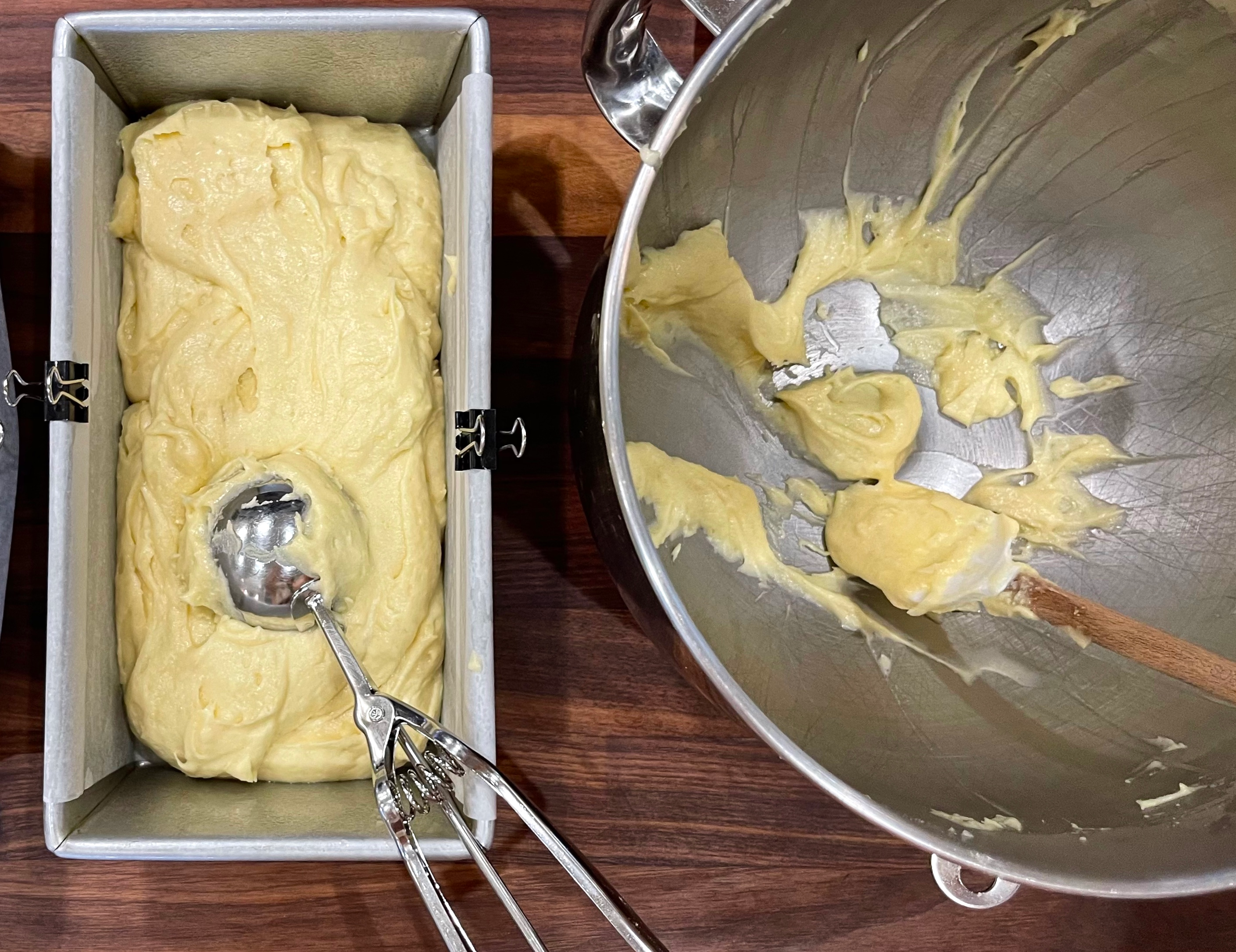 We start with our sour cream pound cake, made rich with butter and a half-dozen eggs, tender and moist from sour cream. Flour sifted with a touch of kosher salt and a pinch of baking soda adds to a light texture. Lime is added in triplicate with fresh lime zest, lime juice and a touch of pure lime oil, all deepened with the addition of pure vanilla extract.