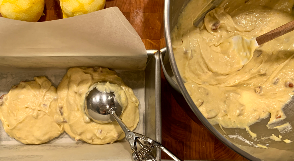 This starts as a traditional quick bread – butter, sugar and whole eggs blended with flour, baking powder and a touch of kosher salt plus a touch of milk.